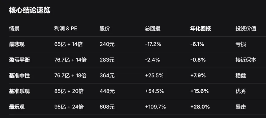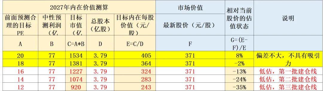 综合结论:当前股价371元对应2027年隐含PE18.3倍,已基本反映未来三年增速回落的预期,估值处于合理偏贵区间,短期并非布局“捡便宜”的好时机。