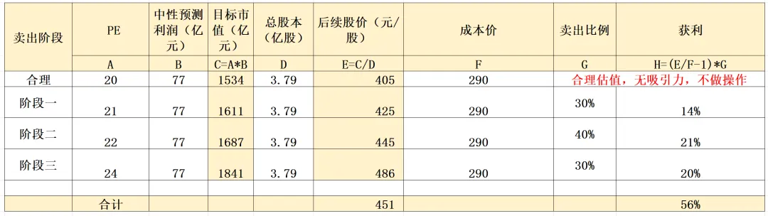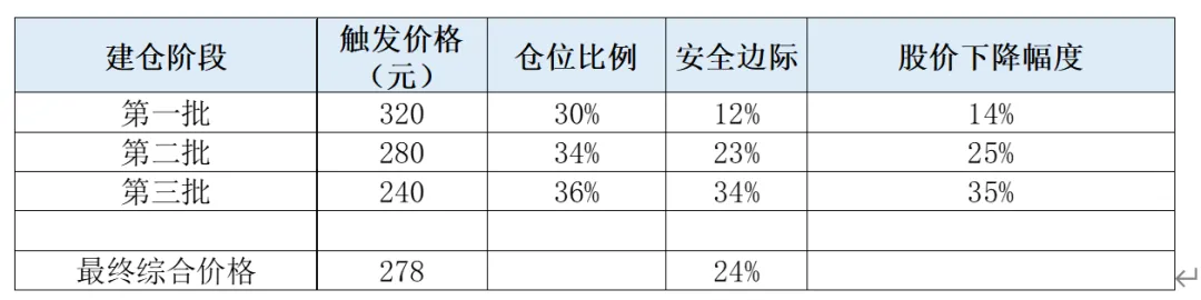 我采用分批建仓模式,根据PE倍数回落幅度设定三批触发价格,逐步提升仓位,让平均建仓价达到280-290元左右(下表是278元),具体计划如下: