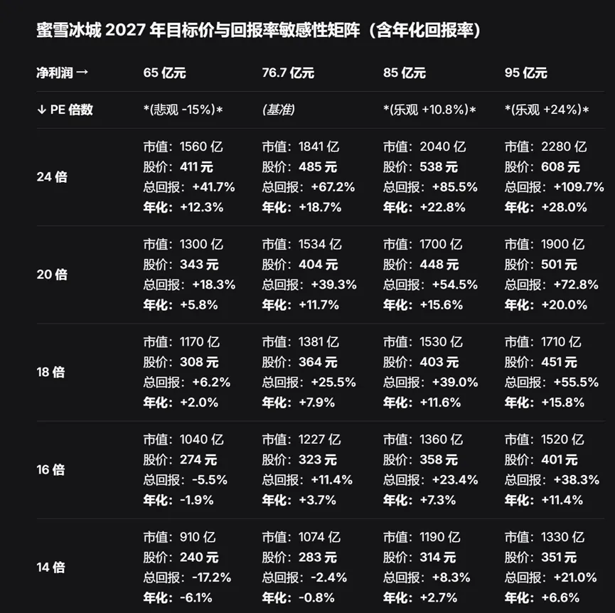 PEG估值理论认为PEG≈1时估值合理。若2027年后长期增速确为16%,则合理PE应约为16-20倍(对应PEG为1-1.25,龙头企业可享一定溢价)。因此我给出蜜雪集团2027年的合理PE区间为18-20倍,既匹配业绩增速下行的客观规律,又贴合PEG估值理论。