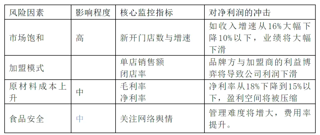 核心投资风险为业绩增速不及预期,需通过分批建仓、动态止盈止损严格把控风险,同时密切跟踪门店增速、净利率等核心指标。