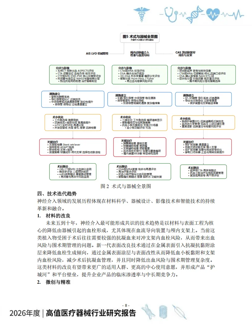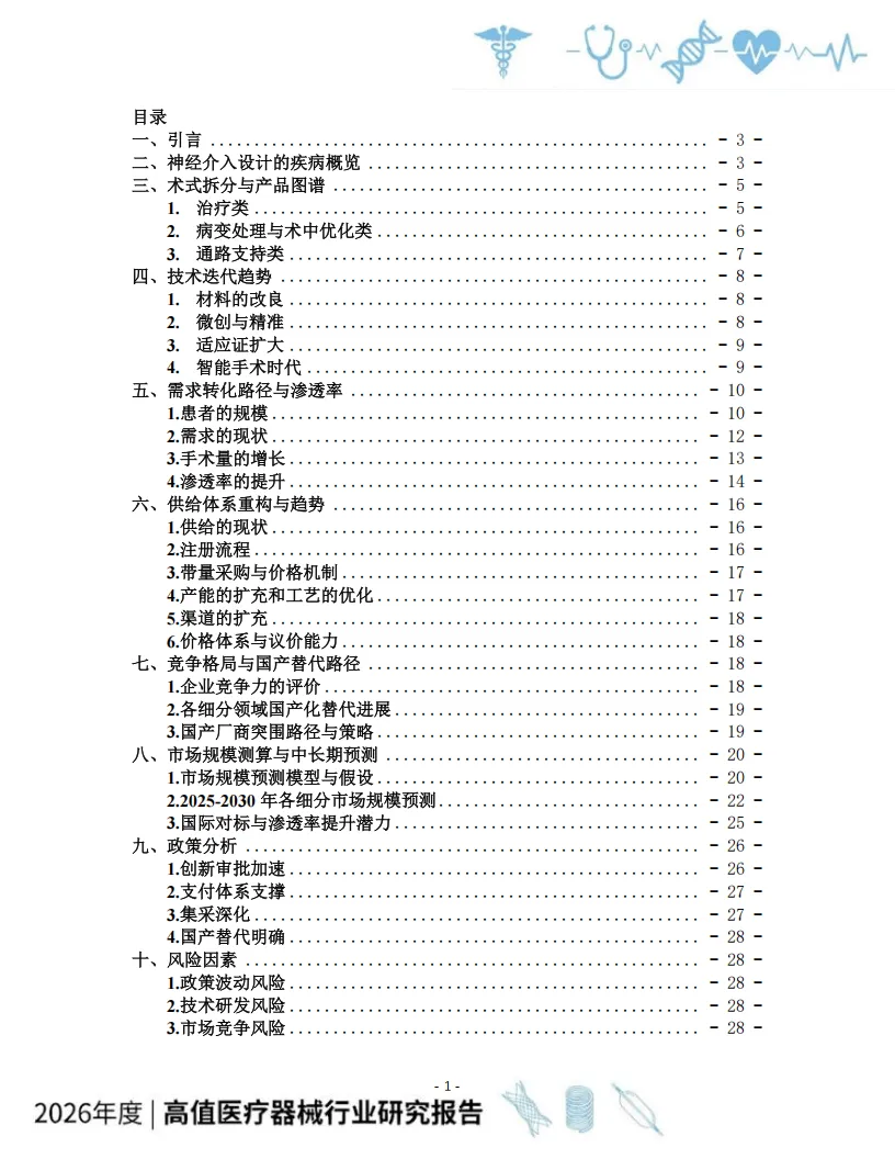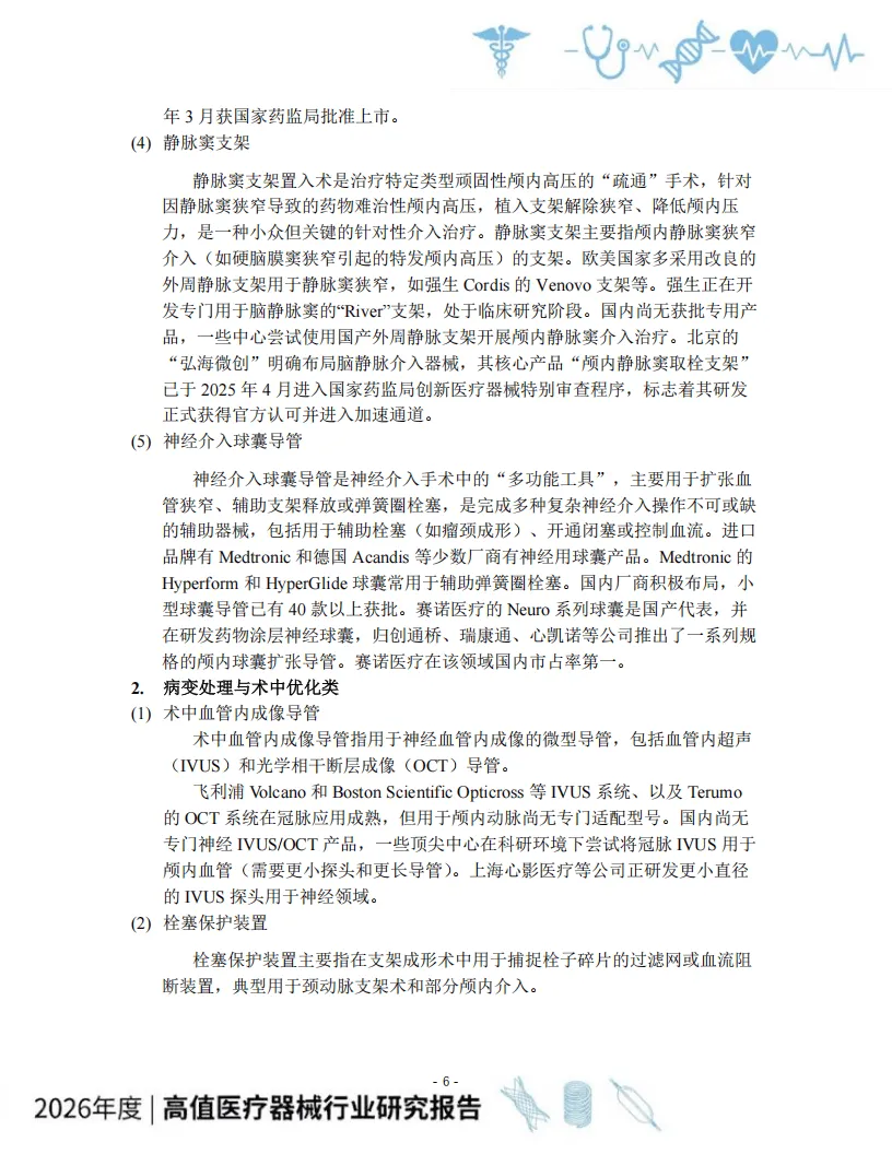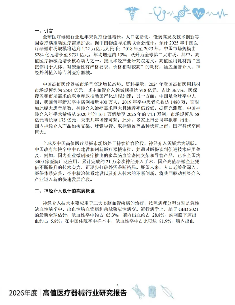 报告聚焦中国神经介入高值耗材行业,分析了行业发展背景、市场需求、技术迭代、国产替代进程及市场规模前景等核心内容。当前中国医疗器械市场稳步扩张,2025年预计达1.22万亿元,高值医用耗材增长更为迅猛,2024年市场规模约2504亿元,其中血管介入领域占比36.7%,神经介入作为血管介入的高弹性赛道,在老龄化、慢病高发与技术升级的驱动下迎来发展机遇。