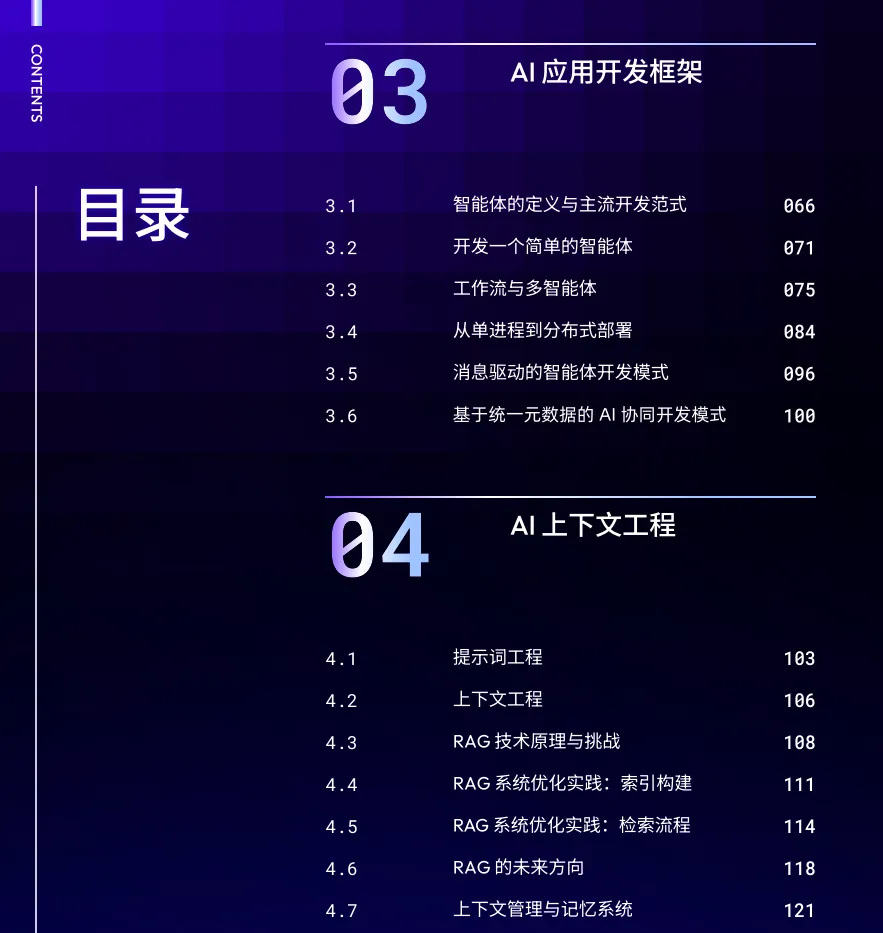 上下文工程是提升输出效果的重要手段。本章介绍了提示词、RAG、Memory的定义、功能和业内主流技术方案,以及未来的演进方向,同时,提供了我们的一线实践,例如提示词调优、RAG检索构建和检索流程优化、多级记忆系统构建等。