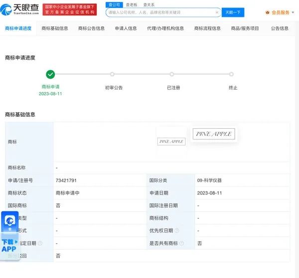 据天眼查App显示,8月11日,苹果公司申请注册了多个“PINE APPLE”商标,国际分类涉及科学仪器、广告销售、建筑修理等领域,当前商标状态均为申请中。