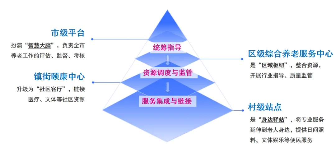 市级平台扮演“智慧大脑”,负责全市养老工作的评估、监督、考核;区级综合养老服务中心作为“区域枢纽”,整合资源,开展行业指导和质量监管;镇街颐康中心升级为“社区客厅”,链接医疗、文体等社区资源;村级站点则是“身边驿站”,将专业服务延伸到老人身边,提供日间照料、文体娱乐等便民服务。