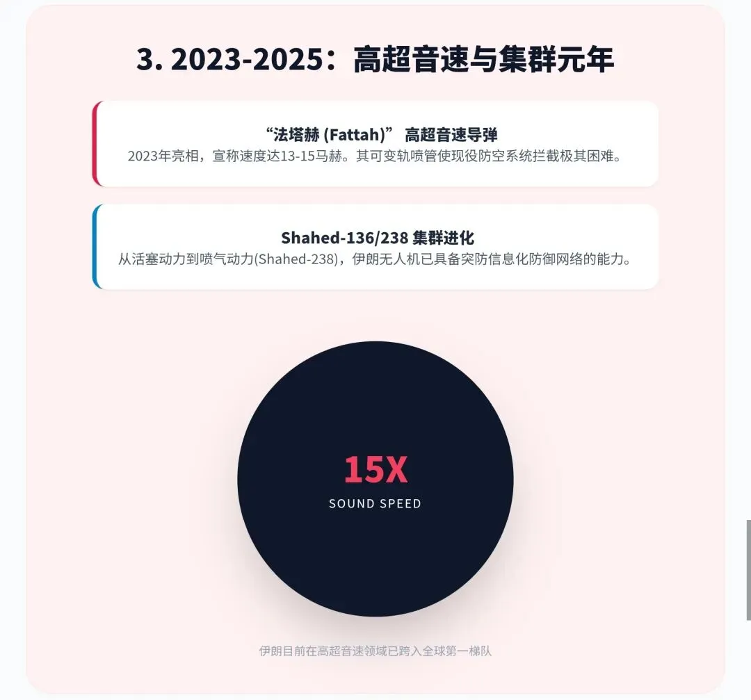 高超音速突破: 2023年亮相的“法塔赫”(Fattah)系列,标志着伊朗成为少数掌握高超音速飞行器技术的国家。其15马赫的速度和末端机动能力,对目前的地区反导网构成了巨大挑战。