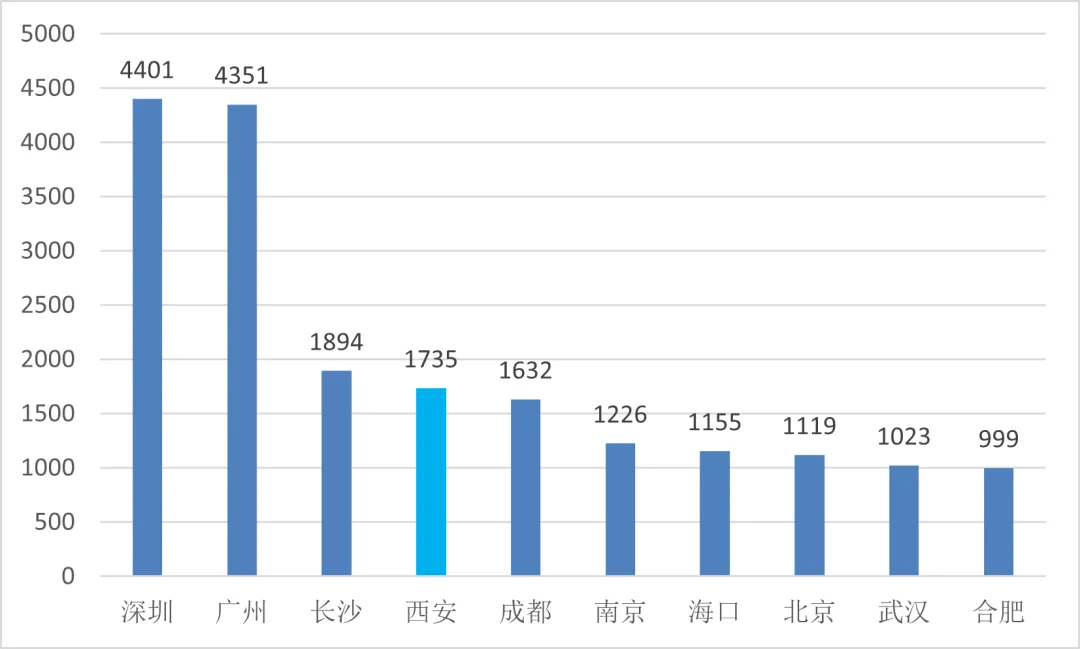 58307家企业中,注册地排名前10的城市共有19535家,占全国企业总数的⅓左右。其中,深圳、广州双双突破4000家大关,第3至10名城市,企业数量均在一两千家。