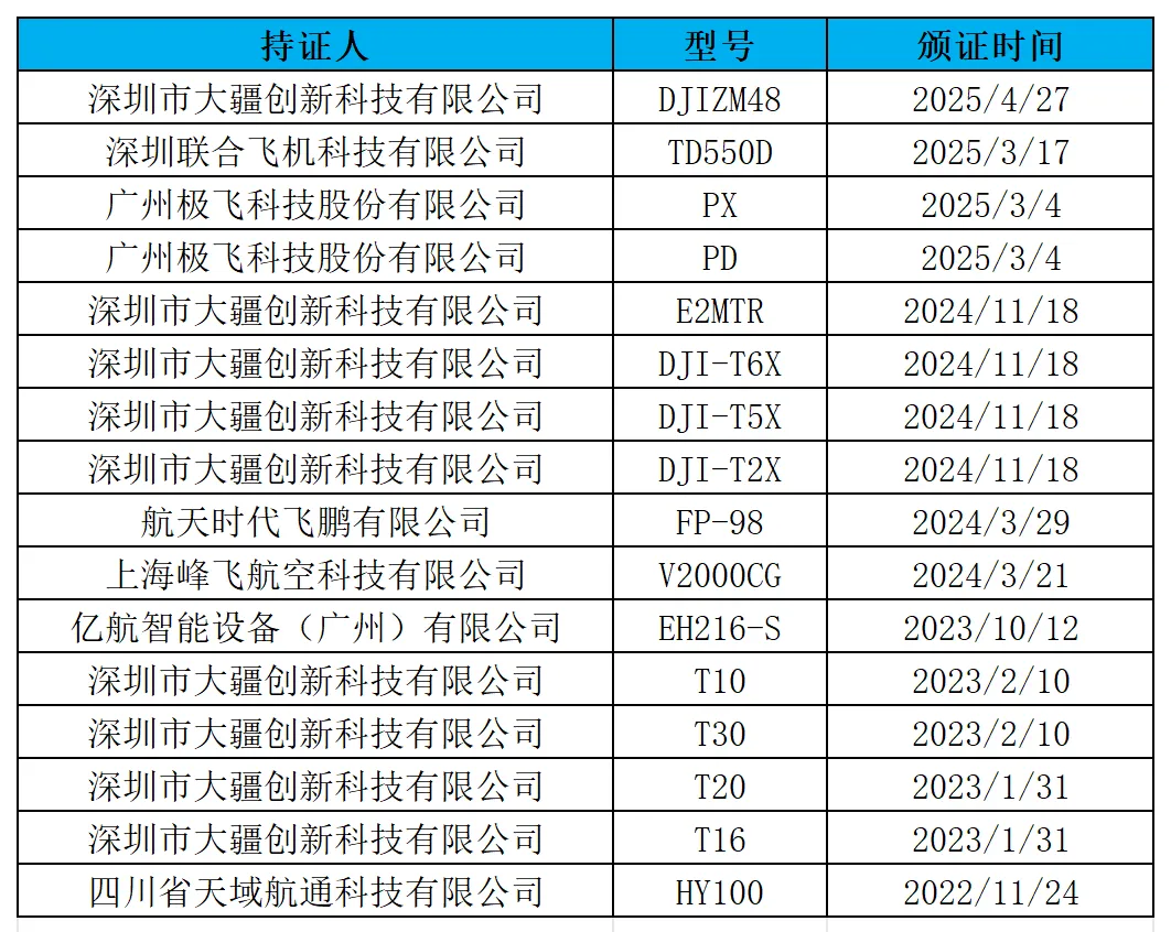 表6:已取得TC证的无人机型号