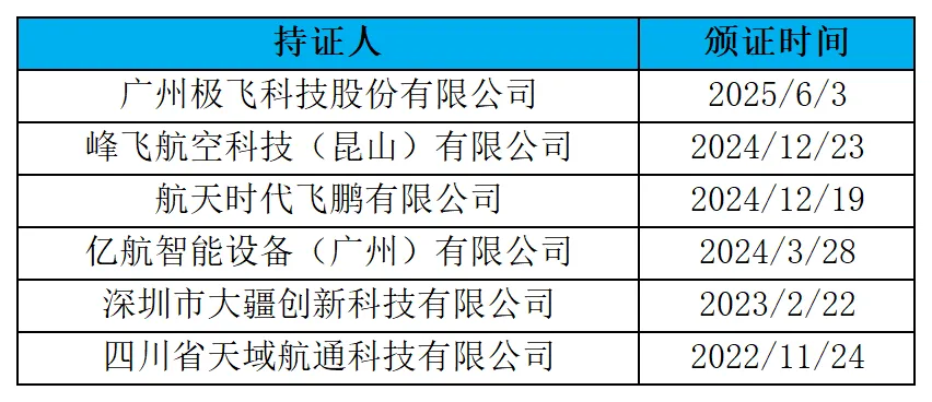 表7:已取得PC证的无人机型号
