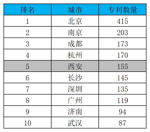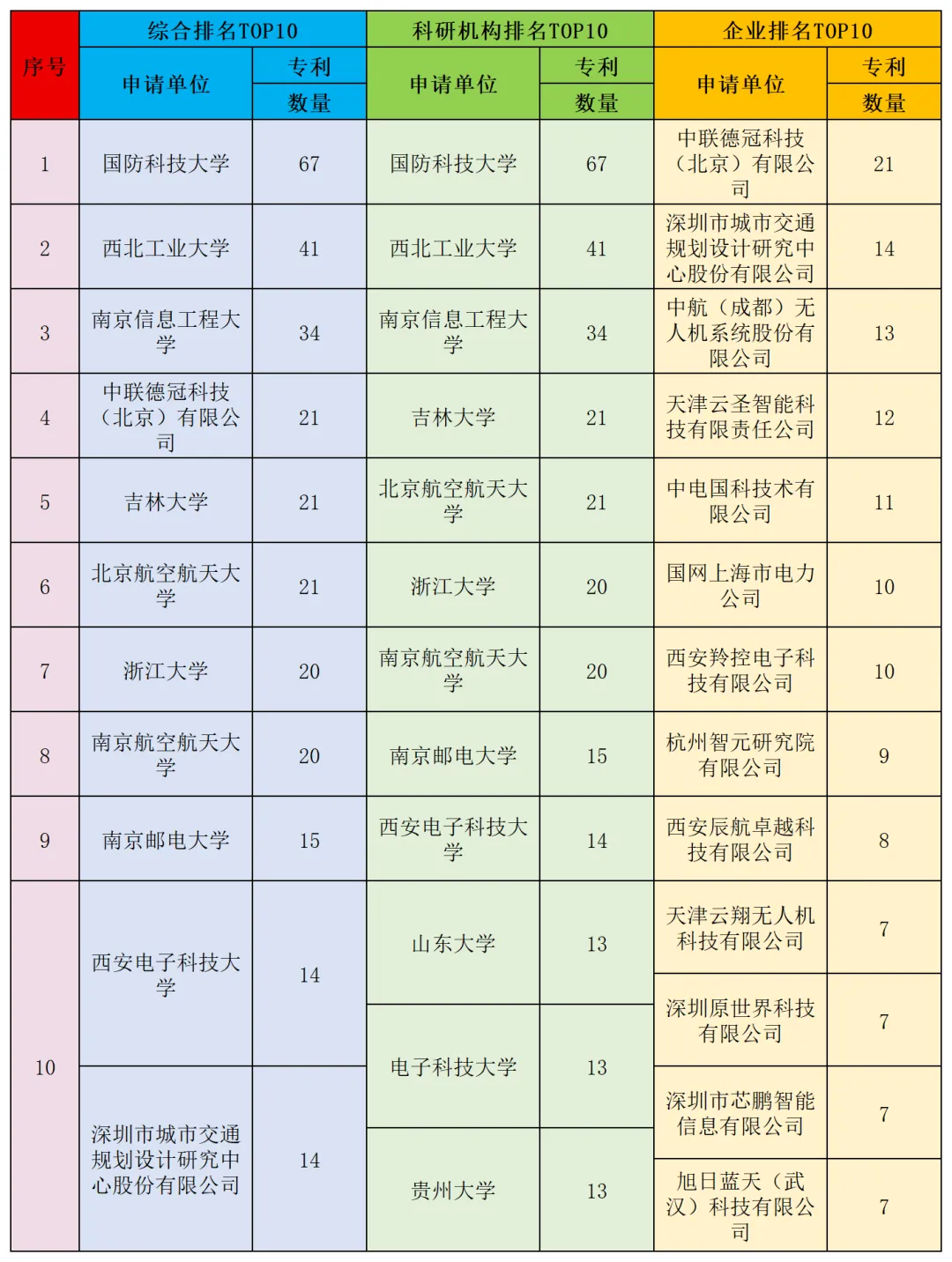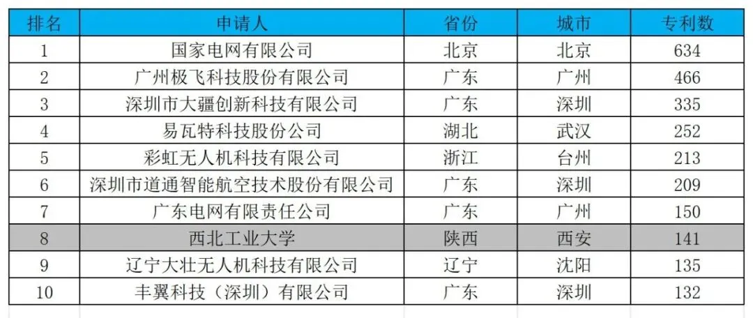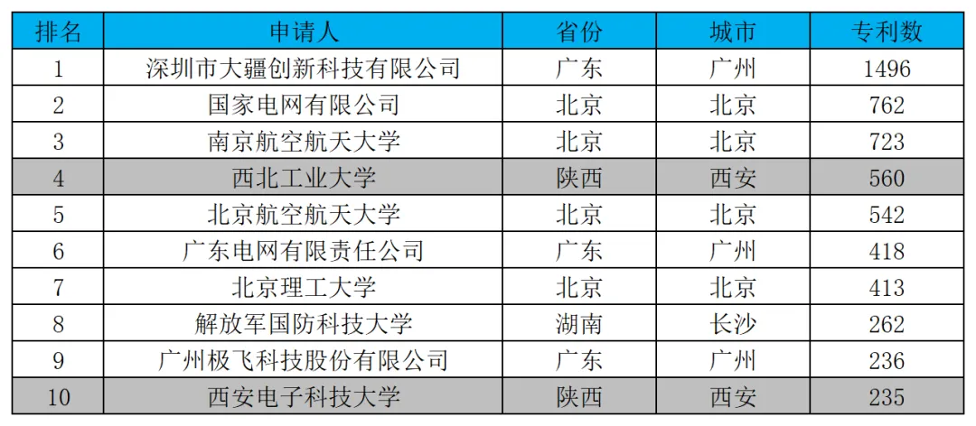 表10:近一年各城市无人机相关发明专利TOP10