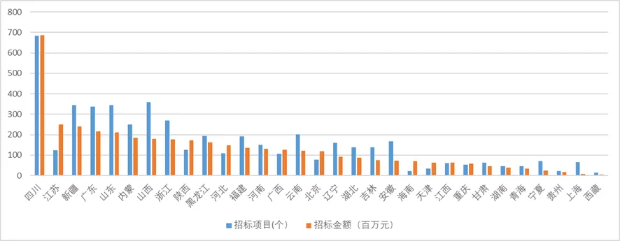 全国共有17个省市无人机相关项目招标金额总计超过1亿元,其中四川最多,为6.87亿元;江苏、新疆、广东、山东均在2亿多元;内蒙古、山西、浙江、陕西、黑龙江、河北、福建、河南、广西、云南、北京均为1亿多元。