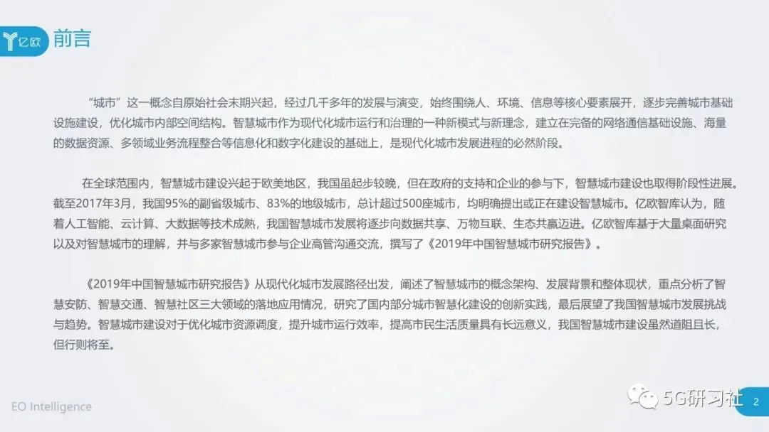 报告显示,在全球范围内,智慧城市建设兴起于欧美地区,我国虽起步较晚,但在政府的支持和企业的参与下,智慧城市建设也取得阶段性进展。截至 2017 年 3 月,我国 95% 的副省级城市、 83% 的地级城市,总计超过 500 座城市,均明确提出或正在建设智慧城市。亿欧智库认为,随着人工智能、云计算、大数据等技术成熟,我国智慧城市发展将逐步向数据共享、万物互联、生态共赢迈进。亿欧智库基于大量桌面研究以及对智慧城市的理解,并与多家智慧城市参与企业高管沟通交流,撰写了 《 2019 年中国智慧城市研究报告 》 。