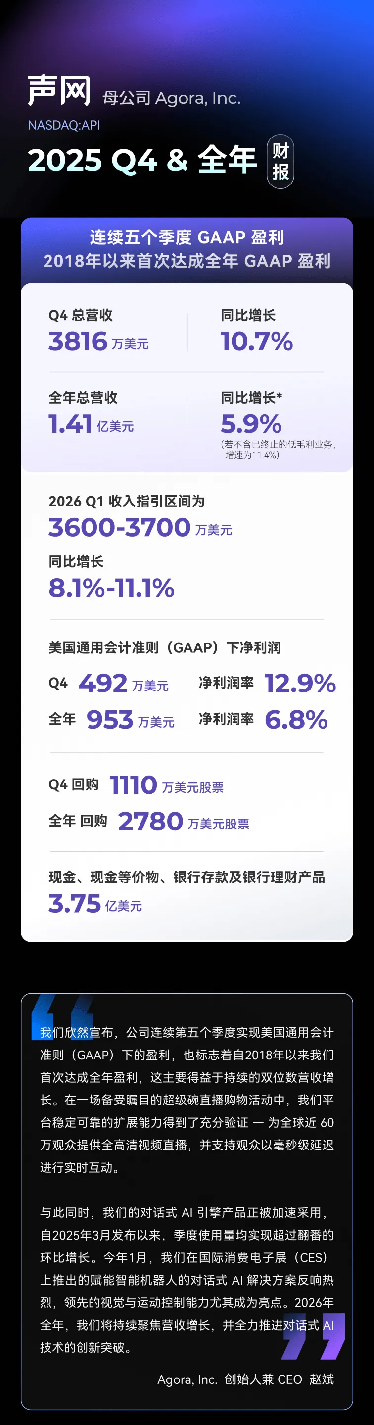 声网母公司2025 Q4及全年财报:营收增长10.7%,连续五季GAAP盈利