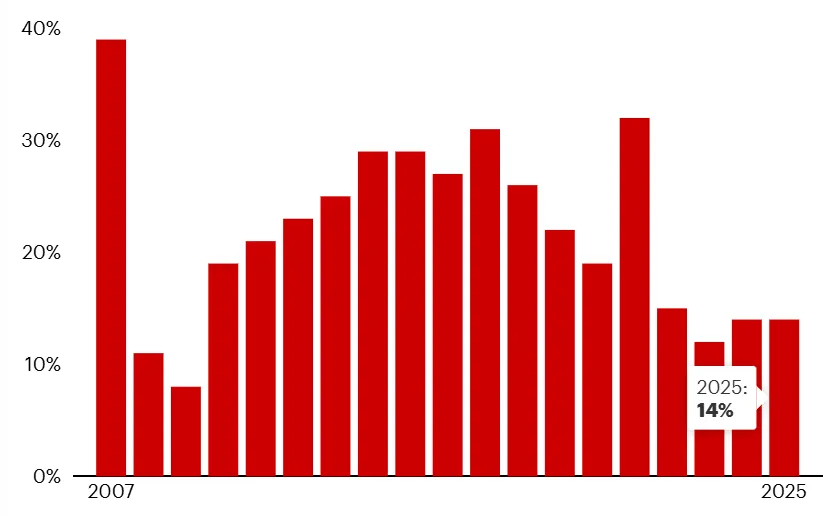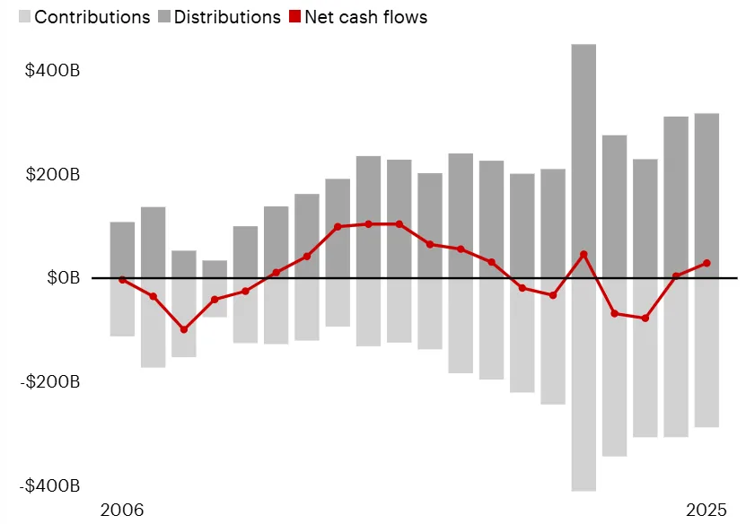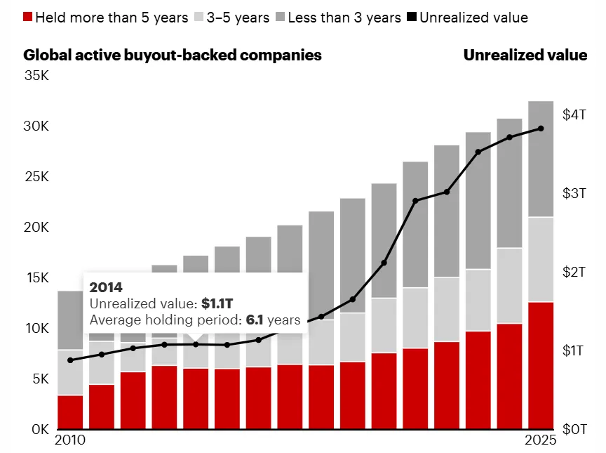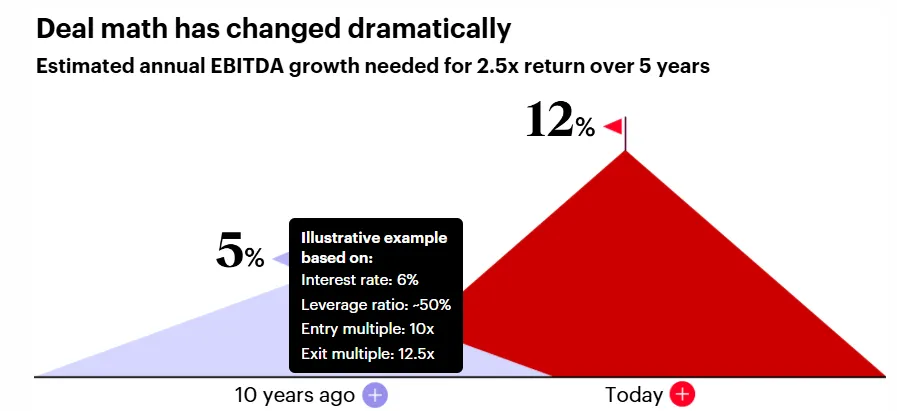 私募股权基金已经连续四年无法向投资者提供满意回报了——背后是32,000 家未退出的项目,总价值约3.8万亿美元。 项目退出所需的时间更长:现在平均需要大约7年时间,而2010年至2021年期间的平均时间为5~6年。 2025年,私募股权基金向投资者的分配仅占净资产(NAV)的14%,这是自2008年全球金融危机以来的最低水平。 “如今实现12%的EBITDA增速才能达到10年前5%的水平”。 例如,在2015年典型的收购案中,杠杆率50%,贷款利率在6%至7%之间。这意味着,最终只需实现5%的EBITDA增长率,即可在五年持有期内获得2.5倍的资本回报率。 如今,贷款利率在8%至9%之间,杠杆率则接近30%至40%,而退出估值并未大幅增长。因此要实现五年内2.5倍的回报,EBITDA的增长幅度需接近10%至12%才可以。