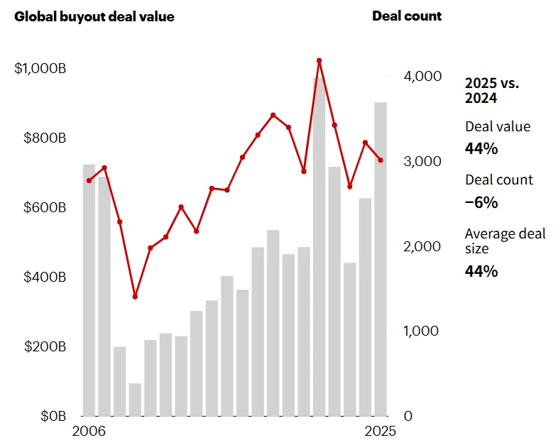 2025年,全球一级市场投资额大幅攀升至9040亿美元,比2024年增长44%(主要受益于少数几笔大额私有化交易,集中在下半年)。然而,交易数量同比下降6%至3018笔,这使得平均披露交易规模达到历史新高12亿美元。