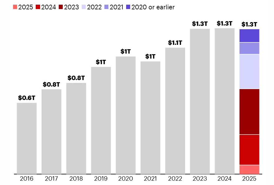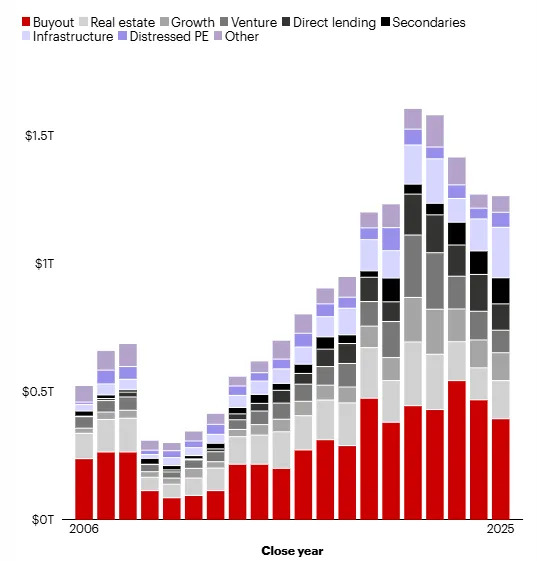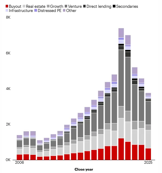 2025年,全球一级市场共募集了1.3万亿美元,与2024年的总额基本持平,这主要得益于基础设施基金的强劲增长。但并购基金规模下降了16%,至3950亿美元。此外,2025年全行业募集的基金总数下降了18%,并购基金总数下降了23%。