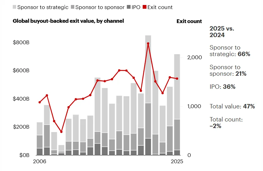 并购退出同比增长47%,达到7170亿美元,这主要得益于几笔大额的退出交易——仅7笔价值超过100亿美元的退出交易就为全球总额贡献了1550亿美元,增幅达22%,使得2025年成为有史以来退出交易额第二高的年份。
