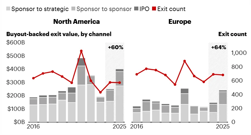 全球IPO数量增长了36%,但对于PE投资而言,IPO仍然是次要的退出途径。(这一点不同于中国的PE投资,尽管2025年上市公司收购也成为诸多基金退出的重要通道。)