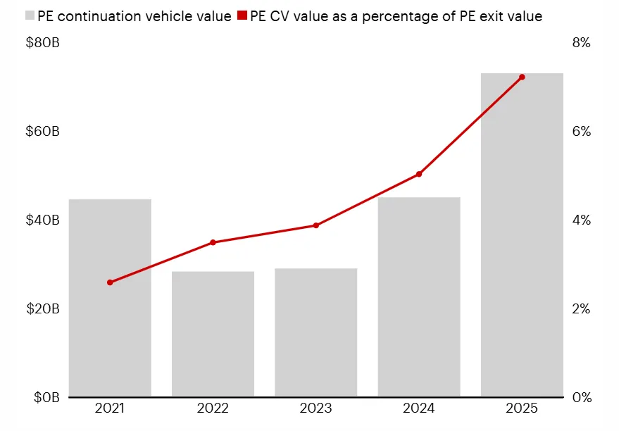 私募股权二级市场在2025年继续成为重要的退出渠道:二级市场交易额同比增长41%。由GP主导的延续基金(Contiuation Vehicle)允许基金在保留资产的同时向有限合伙人返还资本,其增长速度甚至更快(同比增长62%,自2022年以来年均增长37%)。当然,这一退出渠道仅占退出总额的10%不到。