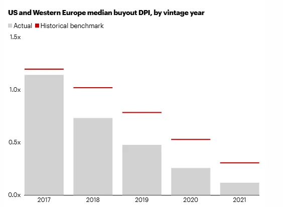 但是,如果从衡量管理人退出压力的分配额占净资产值比(NAV)来看,仅维持在14%的水平,是自2008-09年全球金融危机中期以来的最低水平。这也为后面的募资压力埋下了伏笔。