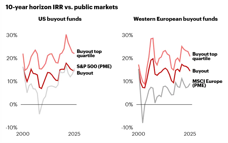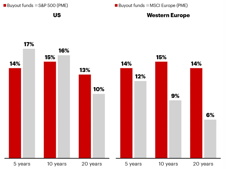 过去十年,美国股票的表现优于收购回报,但在欧洲,私募股权仍然占据主导地位。过去几年美国二级市场气贯长虹,基本抹平了一二级市场之间10年期回报率的历史差距。