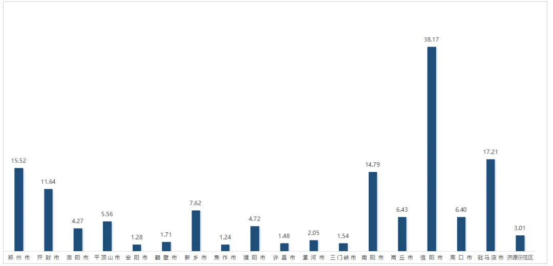 从地市分布来看,信阳市渔业产值具有首位,产值38.17亿元,占比26.39%,紧随其后的为驻马店市、郑州市、南阳市、开封市,产值分别为17.21亿元、15.52亿元、14.79亿元、11.64亿元,上述5市也是河南省各地市中渔业产值超过十亿元的地市,其余地级市渔业产值均未超过十亿元。