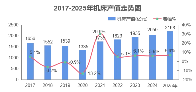 2025年中国金属加工机床产值为2198亿元,同比增长6.9%。且2020年以来机床产值呈持续增长的态势,至2024年达到2000亿元的规模,具体如下。