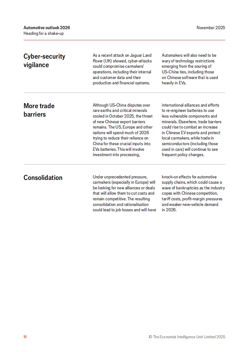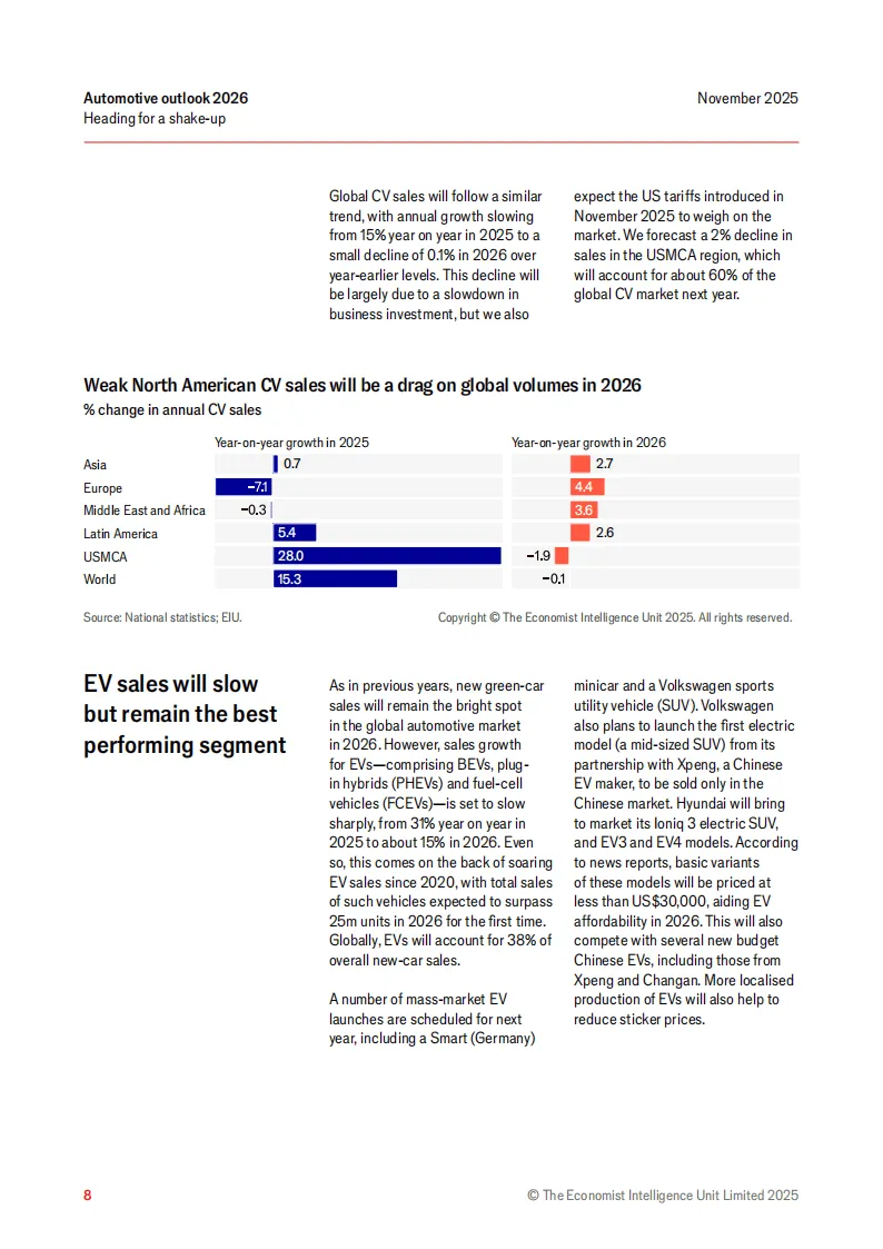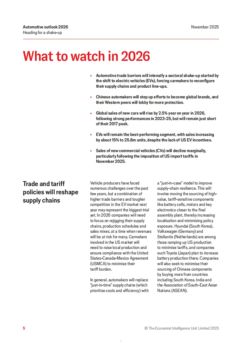 经济学人智库2026年全球汽车行业展望报告指出,2026年全球汽车行业将迎来深度变革,电动化转型叠加贸易壁垒升级,推动行业供应链、市场格局与竞争态势全面重构,行业整体呈现“增长放缓但结构分化”的特征。