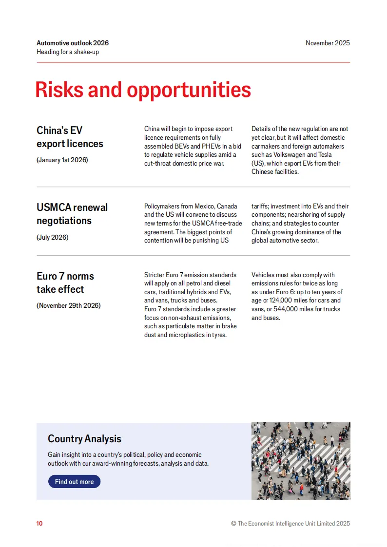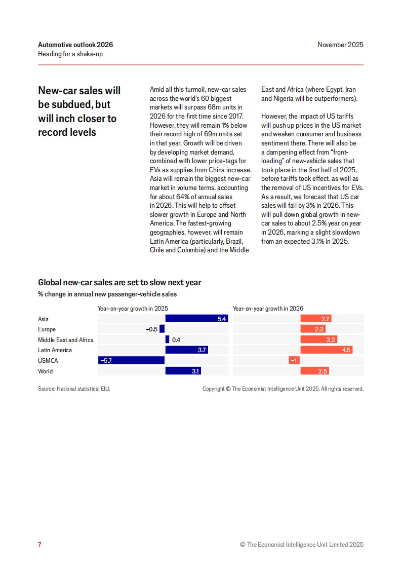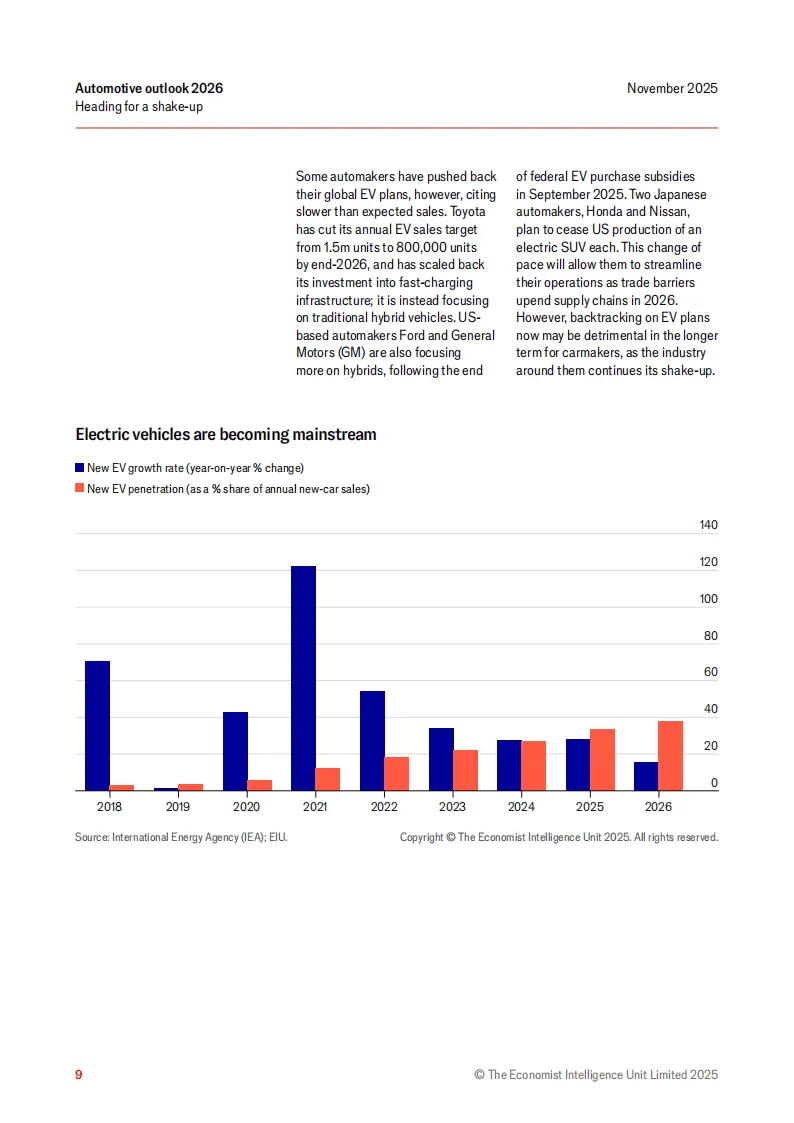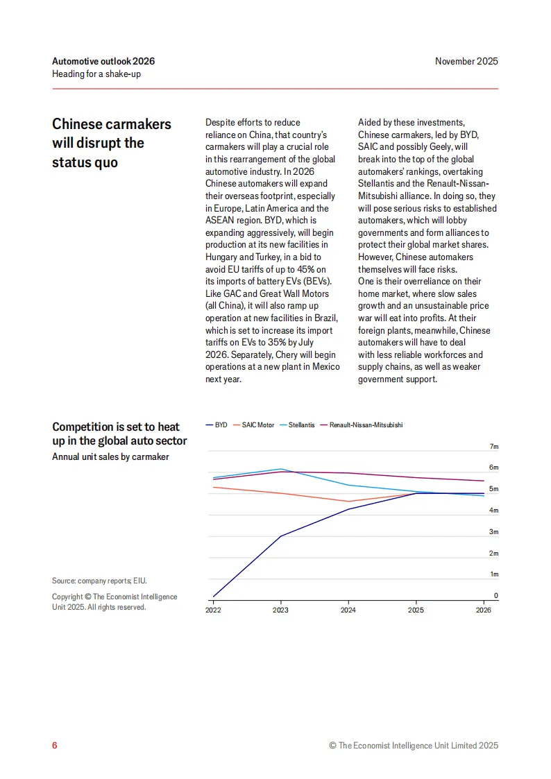 经济学人智库2026年全球汽车行业展望报告指出,2026年全球汽车行业将迎来深度变革,电动化转型叠加贸易壁垒升级,推动行业供应链、市场格局与竞争态势全面重构,行业整体呈现“增长放缓但结构分化”的特征。