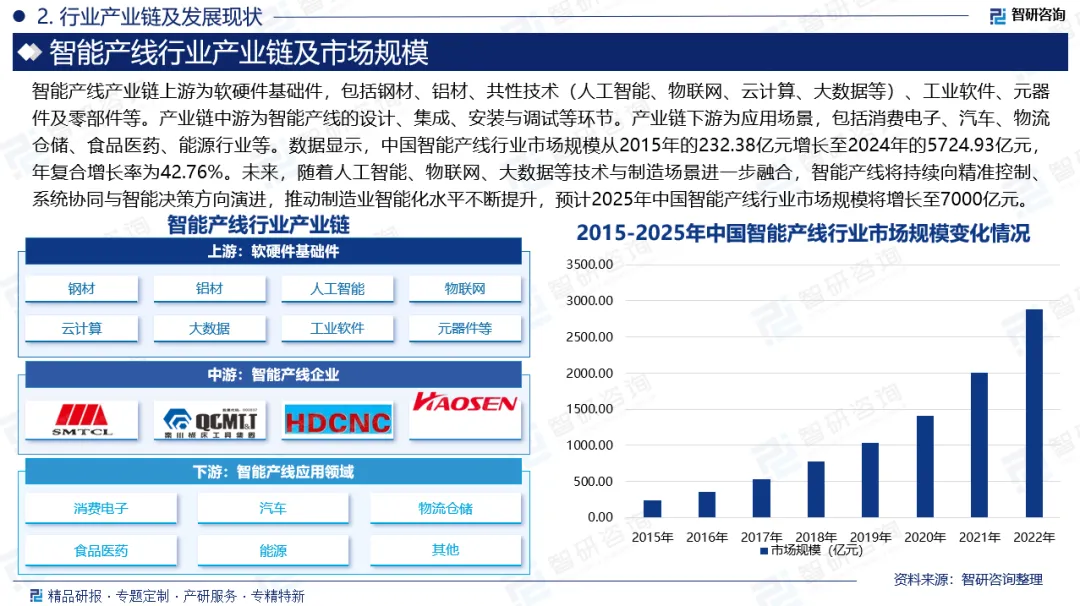 智能产线全称为智能化生产线,是指利用物联网、人工智能、传感器等技术打造起来的一种具有自动化、智能化、信息化特点的生产线。与传统的生产线相比,智能产线具有高度智能化、高度自动化和高度信息化等特点。随着科技的不断进步和工业的快速发展,智能产线已经成为现代制造业的重要代表。智能产线在生产中发挥着越来越重要的作用。首先,智能产线可以大幅提高生产效率。传统的生产线需要人工操作,生产效率受到工人技能、疲劳等多种因素的影响。而智能产线通过自动化设备和智能控制系统,可以实现生产过程的自动化和智能化,极大地提高了生产效率。其次,智能产线可以提高产品质量。智能产线可以对生产过程进行实时监控和调整,及时发现和解决问题,从而保证了产品的质量和稳定性。最后,智能产线还可以降低生产成本。通过减少人工干预和提高生产效率,智能产线可以降低生产成本,提高企业的竞争力。近年来,在政策引导、产业升级与技术创新的共同推动下,智能产线凭借其在提升质量、效率和降低成本方面的显著优势,实现了市场规模的高速扩张。数据显示,中国智能产线行业市场规模从2015年的232.38亿元增长至2024年的5724.93亿元,年复合增长率为42.76%。未来,随着人工智能、物联网、大数据等技术与制造场景进一步融合,智能产线将持续向精准控制、系统协同与智能决策方向演进,推动制造业智能化水平不断提升,预计2025年中国智能产线行业市场规模将增长至7000亿元。当前,智能产线市场的竞争格局呈现出多维度分化的特征。从全球范围看,以西门子、霍尼韦尔、ABB等为代表的国际领先企业,凭借其在核心技术、品牌影响力和全球解决方案交付能力方面的积累,仍占据市场主导地位。与此同时,随着国内制造业转型升级进程的加速,中国本土智能产线企业正迅速崛起,逐步构建起差异化的竞争优势。在国内市场,以沈阳机床、秦川机床、华东数控、豪森智能、雷赛智能、步科股份、科大智能、克来机电、成都环龙智能、菲尼克斯(南京)智能制造等为代表的代表性企业,通过持续的技术积累、贴近用户的服务响应机制以及突出的成本控制能力,不断提升市场份额,逐步形成与国际品牌同台竞争的态势。