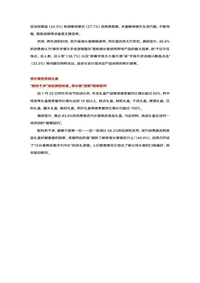 日前,京东消费及产业发展研究院向 5000 名消费者发起的“2026 年货节消费调研”也显示: 第一波年货购置时,大家重点关注和考虑的对象是父母及长辈,45.6%的人会在第一波年货购置时先把过年要给爸妈置办的东西和心意准备到位。在为长辈挑选年礼时,健康与安全是首要考量因素(47.1%),其次是考虑长辈的真实需求与喜好,尊重他们的生活习惯和明确表达的愿望(46.8%),第三点则是关注礼物的实用性与会被使用的频率(42.4%)。孝心年礼的关注点变化,是孝心表达的成熟、理性和走心的体现,读懂长辈的真实需求,让礼物的价值不再由外在标签定义,而取决于能否真正融入长辈日常生活并提升其生活质量,让长辈在日常里反复感受到被惦记。
