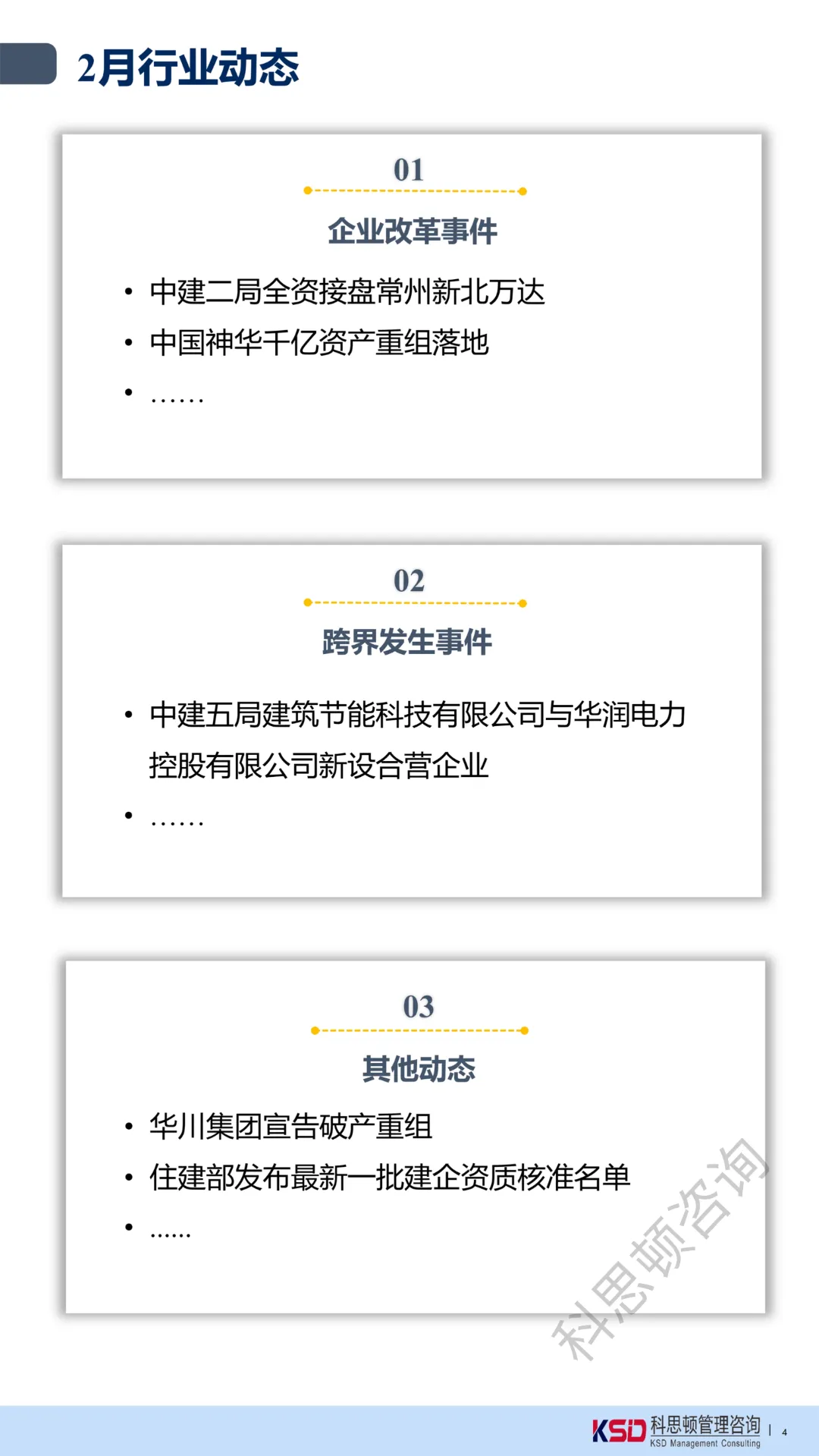 自2021年5月起,我们每月定期推出《科思顿工程行业月度观察》,内容涵盖行业最新政策信息,包括国家各部委和地方政府主管部门发布的与工程建设行业密切相关的政策,行业的重要数据,行业最新的热点动态事件,包括国企改革与重组热点事件追踪、企业资本运作热点事件追踪、以及其他热点动态。