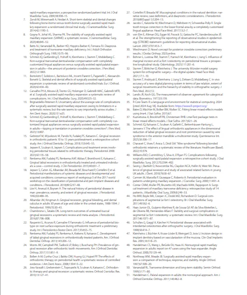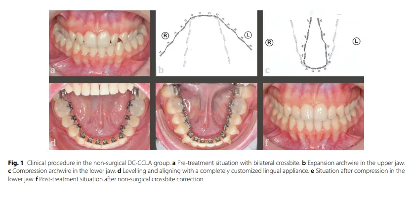 后牙反?是一种常见的错?畸形,在欧洲人群中患病率高达 15%。成人后牙反?的治疗方案通常包括手术辅助快速上颌扩弓(SARPE)、节段性骨切开术、微种植体辅助快速上颌扩弓(MARPE)或牙槽骨代偿。每种方案都有一定的优点和缺点。SARPE 是一种用于骨骼成熟患者上颌骨横向扩宽的外科手术,旨在减弱扩弓的主要阻力。迄今为止,关于 SARPE 的适应证尚无共识。虽然骨性 SARPE 的理论——牙性副作用更小、复发更少——似乎很有前景,但研究未能显示骨承力或牙承力 SARPE 在骨骼/牙齿效应和复发方面存在显著差异。根据专家意见,高达5毫米的横向颌骨宽度不调可以通过牙槽骨代偿进行非手术矫治。然而,一项回顾性研究表明,当使用完全个性化舌侧矫治器(CCLAs)在上下颌同时进行矫治,上颌使用扩弓弓丝、下颌使用缩弓弓丝时,即使是更大程度的横向宽度不调也可以通过牙槽骨代偿进行矫治。