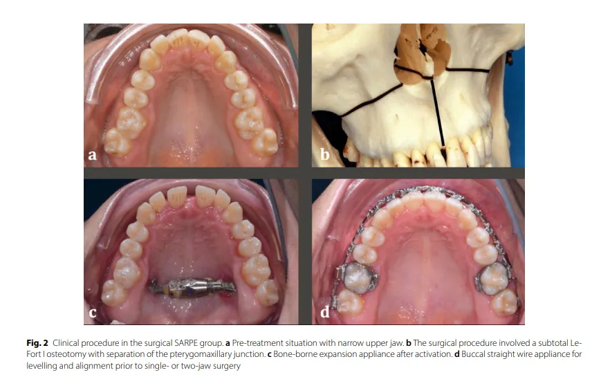 SARPE 组的纳入对象为 2018 年至 2021 年期间在德国明斯特大学医院颅颌面外科连续接受手术的成年患者。所有患者均接受了伴有翼上颌连接分离的上颌骨次全 Le-Fort I 型截骨术和颊侧直丝矫治器(图 2)。使用了骨承力或牙承力扩弓装置,所有患者均接受了颊侧直丝矫治器进行排齐整平。随后,每位患者都接受了双侧矢状劈开截骨术(BSSO)或 BSSO 联合 Le-Fort I 型截骨术的正颌手术。如前所述,手术干预采用龈缘切口。正颌手术采用 Digital Münster Model Surgery(DMMS)系统进行规划。研究期间连续治疗的患者数量决定了两个组的样本量。