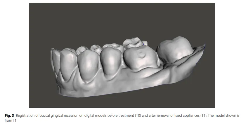 主要结局指标是每个牙齿在 T0 和 T1 时是否存在唇侧牙龈退缩(是/否),类似于 Renkema 等人的方法。两名经验丰富的正畸医生采用基于共识的方法共同仔细评估数字模型,充当一名评估者。在评分前,两名评估者都进行了校准以最小化变异。如果评估者之间的评分存在差异,则达成共识。根据 2017 年牙周和种植体周围疾病和状况分类世界研讨会的第3工作组共识报告,牙龈退缩被定义为龈缘向根方移位。如果唇侧牙根面明显暴露,则记录为退缩(图 3)。如果在 T0 和 T1 模型上能够记录牙龈退缩,则该牙齿被归类为有效。在 T0 和/或 T1 无法评估的牙齿、在矢状向移动的牙齿或缺失牙被归类为无效。评估者对治疗组别不知情,因为所有数字模型都分配了隐藏组别身份的假名。