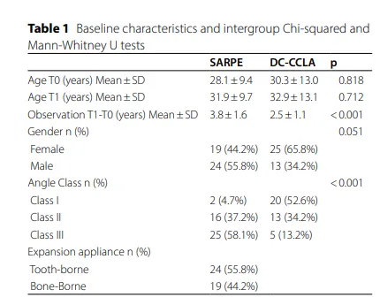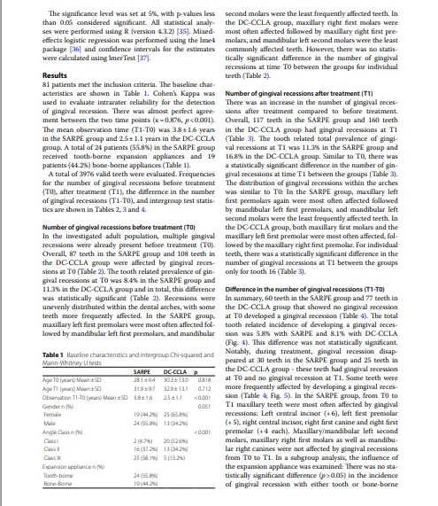 81名患者符合纳入标准。基线特征见表1。使用 Cohen's Kappa 评估检测牙龈退缩的评估者内信度。两个时间点之间具有几乎完美的一致性(κ=0.876,p<0.001)。SARPE 组的平均观察时间(T1-T0)为 3.8±1.6 年,DC-CCLA 组为 2.5±1.1 年。SARPE 组共有 24 名患者(55.8%)接受了牙承力扩弓装置,19 名患者(44.2%)接受了骨承力装置(表 1)。共评估了 3976 颗有效牙齿。治疗前(T0)、治疗后(T1)的牙龈退缩数量、牙龈退缩数量的差值(T1-T0)的频率以及组间检验统计量见表 2、表 3 和表 4。