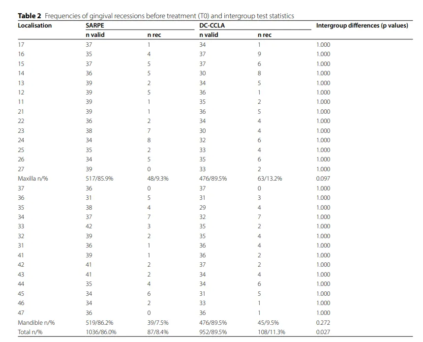 治疗前(T0)牙龈退缩的数量在调查的成人群体中,治疗前(T0)已存在多处牙龈退缩。总体而言,SARPE 组有 87 颗牙齿,DC-CCLA 组有 108 颗牙齿在 T0 时存在牙龈退缩(表 2)。T0 时,SARPE 组的牙齿相关牙龈退缩患病率为 8.4%,DC-CCLA 组为 11.3%,总体上,该差异具有统计学显著性(表 2)。退缩在牙弓内分布不均匀,某些牙齿更常受累。在 SARPE 组,上颌左侧第一前磨牙最常受累,其次是下颌左侧第一前磨牙,下颌第二磨牙是最少受累的牙齿。在 DC-CCLA 组,上颌右侧第一磨牙最常受累,其次是上颌右侧第一前磨牙,下颌左侧第二磨牙是最少受累的牙齿。然而,对于个别牙齿,两组在 T0 时牙龈退缩的数量无统计学显著差异(表 2)。