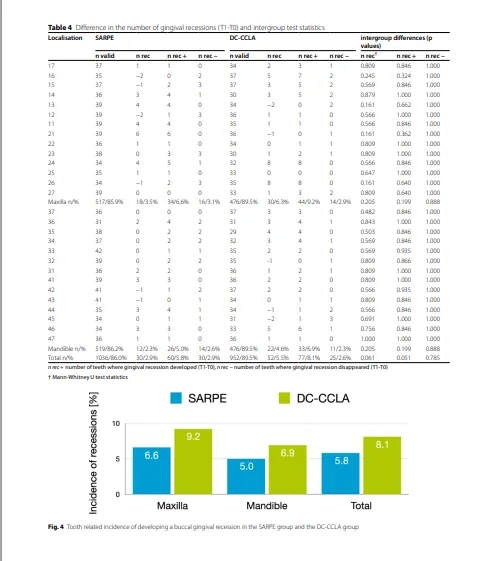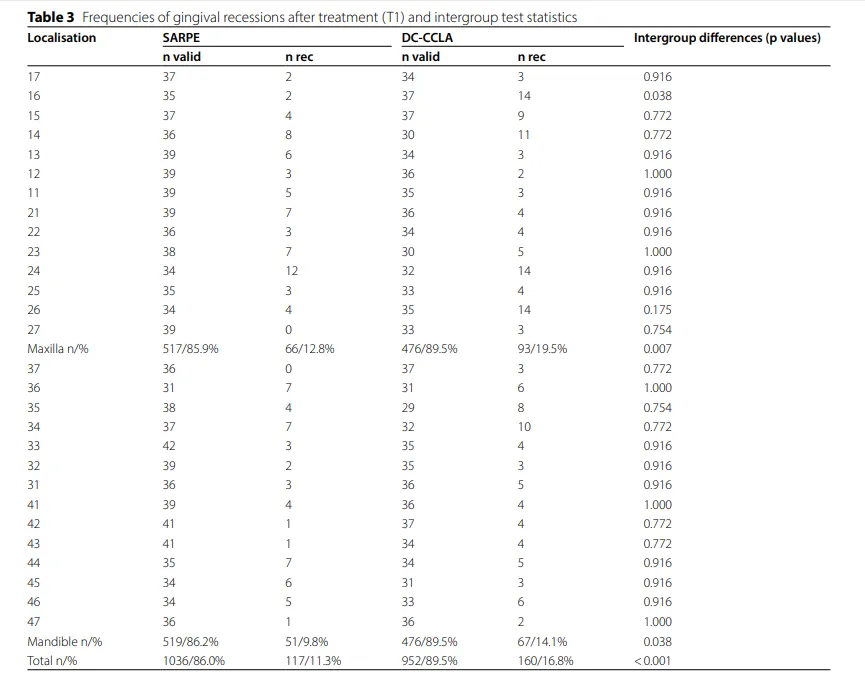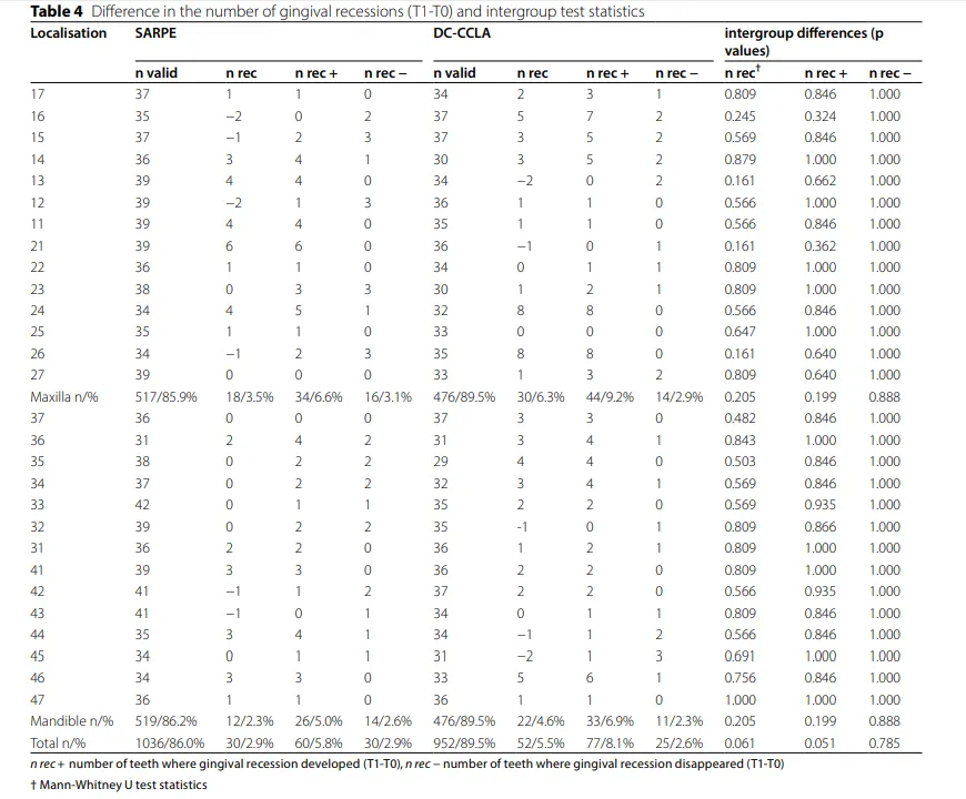 治疗后(T1)牙龈退缩的数量与治疗前相比,治疗后牙龈退缩的数量有所增加。总体而言,SARPE 组有117颗牙齿,DC-CCLA组有160颗牙齿在T1时存在牙龈退缩(表 3)。T1 时,SARPE 组的牙齿相关牙龈退缩总患病率为11.3%,DC-CCLA 组为 16.8%。与T0 类似,两组在T1时牙龈退缩的数量存在统计学显著差异(表 3)。牙弓内牙龈退缩的分布与 T0 相似:在 SARPE 组,上颌左侧第一前磨牙再次最常受累,其次是下颌左侧第一前磨牙,下颌左侧第二磨牙是最少受累的牙齿。在 DC-CCLA 组,上颌第一磨牙和上颌左侧第一前磨牙最常受累,其次是上颌右侧第一前磨牙。对于个别牙齿,仅在牙齿 16 上,两组在 T1 时牙龈退缩的数量存在统计学显著差异(表 3)。