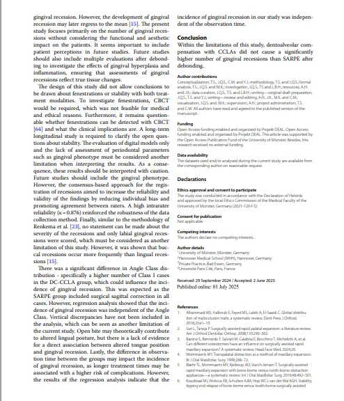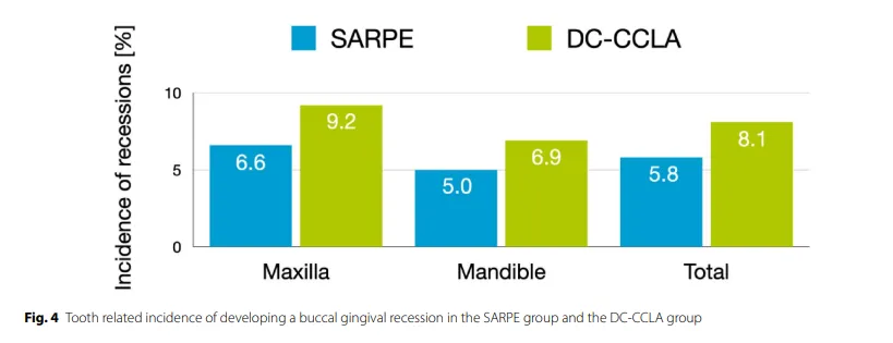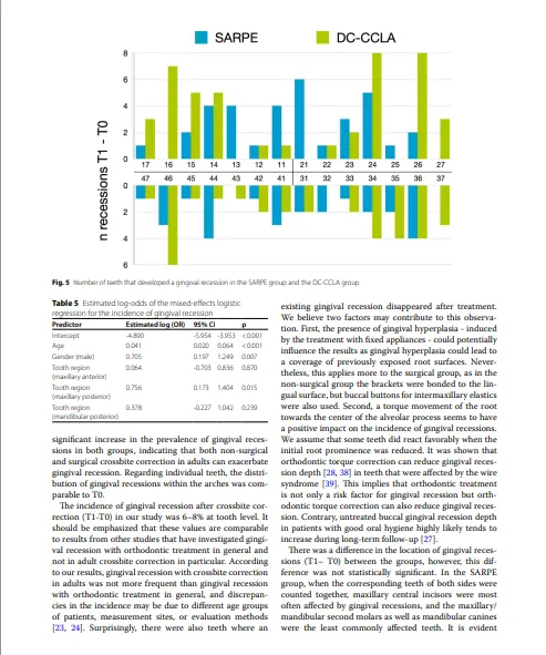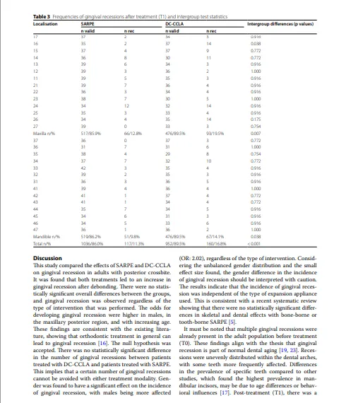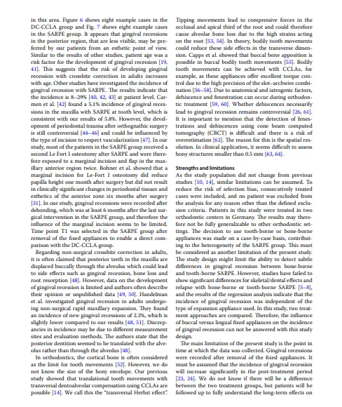 与其他研究的结果类似,患者年龄是发生牙龈退缩的危险因素。这表明成人反?矫治发生牙龈退缩的风险随年龄增长而增加。其他研究调查了 SARPE 后牙龈退缩的发生率。结果表明,在患者水平,发生率为 8-29% 。Carmen 等人发现 SARPE 后上颌牙齿水平的牙龈退缩发生率为 5.1%,这与我们 5.8% 的结果一致。然而,正颌手术后牙周创伤的发展仍存在争议,并可能受到尊重血运的切口类型的影响 。在我们的研究中,SARPE 组的大多数患者在 SARPE 后接受了第二次 Le Fort I 型截骨术,因此在上颌前部区域经历了两次龈缘切口和翻瓣。Bohner 等人表明,Le-Fort I 型截骨术的龈缘切口确实在术后一个月降低了牙龈乳头高度,但术后六个月未导致牙周组织和前牙区美学的临床显著变化。在我们的研究中,牙龈退缩是在脱矫后记录的,对于 SARPE 组,这至少在最后一次手术干预后 6 个月,因此龈缘切口的影响似乎是有限的。在 SARPE 组中选择 T1 时间点(拆除固定矫治器后)是为了能与 DC-CCLA 组进行直接比较。