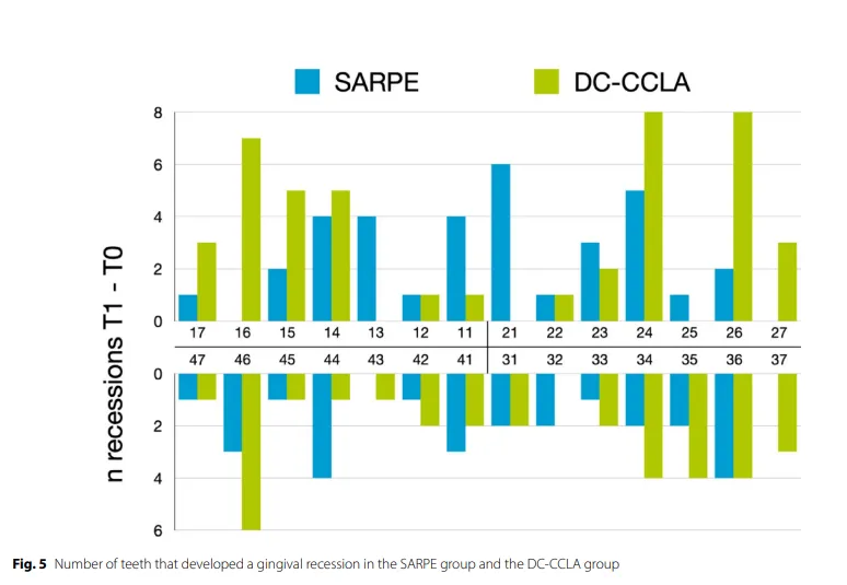 在本研究的局限性范围内,使用 CCLA 进行牙槽骨代偿在脱矫后并未引起比 SARPE 显著更多的牙龈退缩。