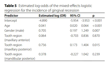 表 5 牙龈退缩发生率混合效应逻辑回归的估计对数几率。