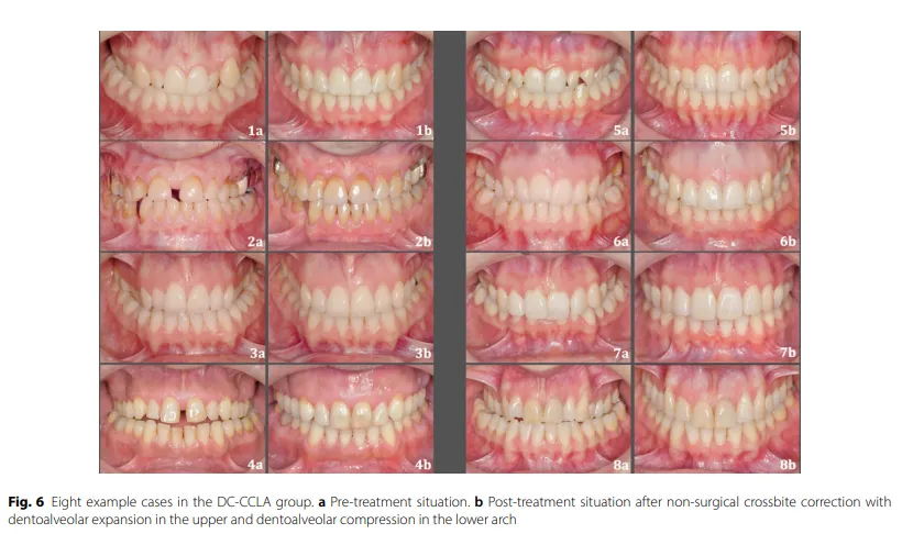 图 6 DC-CCLA 组的八个示例病例。a 治疗前情况。b 通过上颌牙槽骨扩弓和下颌牙槽骨缩弓进行非手术反?矫治后的治疗结束情况。