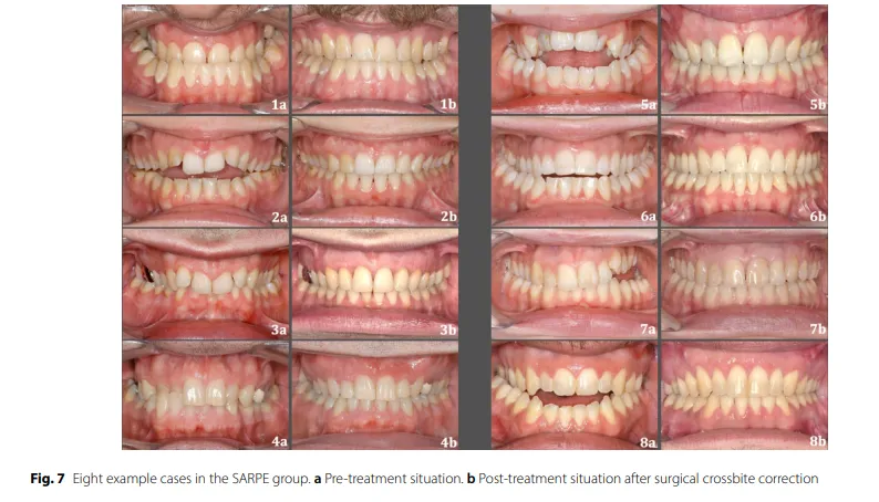 图 7 SARPE 组的八个示例病例。a 治疗前情况。b 手术反?矫治后的治疗结束情况。