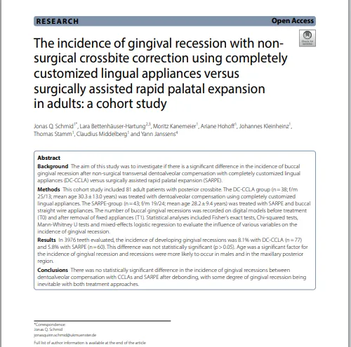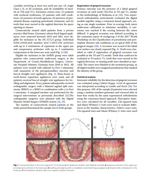本队列研究是一项比较 DC-CCLA 与 SARPE 的随访研究。纳入的患者与前两项研究相同。研究方案已获得德国明斯特大学医学院当地伦理委员会批准(2021-120-f-S),并根据 STROBE 指南进行报告。测量工作在德国明斯特大学医院进行。为比较牙龈退缩,设立了两个组:手术组采用 SARPE 治疗后接颊侧直丝矫治器。非手术 DC-CCLA 组采用 CCLA(WIN,DW Lingual Systems GmbH,巴特埃森,德国)治疗。在两个时间点记录数字模型上的牙龈退缩:治疗前(T0)和固定矫治器拆除后(T1)。