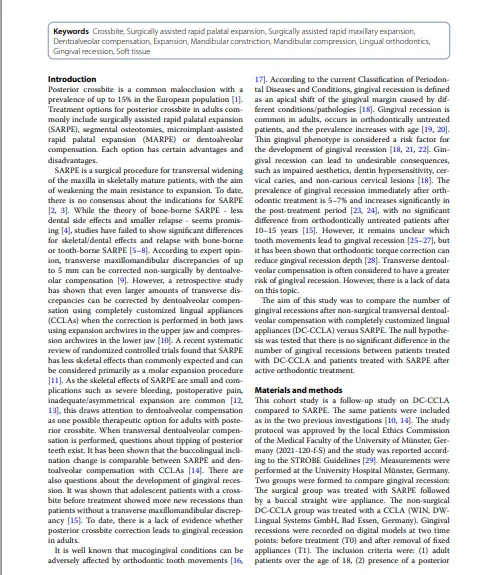 本研究的目的是比较使用完全个性化舌侧矫治器进行非手术横向牙槽骨代偿(DC-CCLA)与 SARPE 后牙龈退缩的数量。检验的零假设是,在主动正畸治疗后,接受 DC-CCLA 治疗的患者与接受 SARPE 治疗的患者之间牙龈退缩的数量无显著差异。