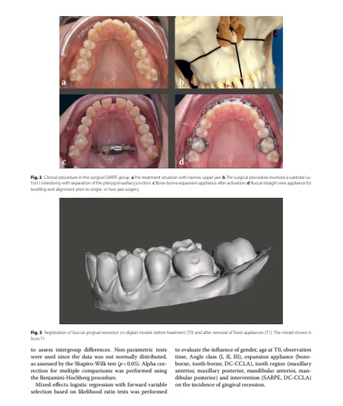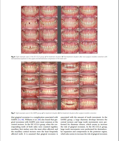 本研究比较了 SARPE 和 DC-CCLA 对成人后牙反?患者牙龈退缩的影响。结果发现,两种治疗都导致脱矫后牙龈退缩的增加。两组之间没有统计学上的显著总体差异,并且无论实施何种干预措施,都观察到了牙龈退缩。发生牙龈退缩的几率在男性、上颌后牙区以及随着年龄增长而更高。这些发现与现有文献一致,表明正畸治疗总体上可导致牙龈退缩。零假设被接受。接受DC-CCLA治疗的患者与接受 SARPE 治疗的患者之间牙龈退缩的数量无统计学显著差异。这意味着无论采用哪种治疗方式,都无法避免一定数量的牙龈退缩。研究发现性别对牙龈退缩的发生率有显著影响,无论干预类型如何,男性受影响更大(OR: 2.02)。考虑到性别分布不均衡以及发现的效应量较小,牙龈退缩发生率的性别差异应谨慎解释。结果表明,牙龈退缩的发生率与所用扩弓装置的类型无关。这与最近的一项系统评价一致,该评价显示骨承力或牙承力 SARPE 在骨骼和牙齿效应方面无统计学显著差异 。(图6-7)