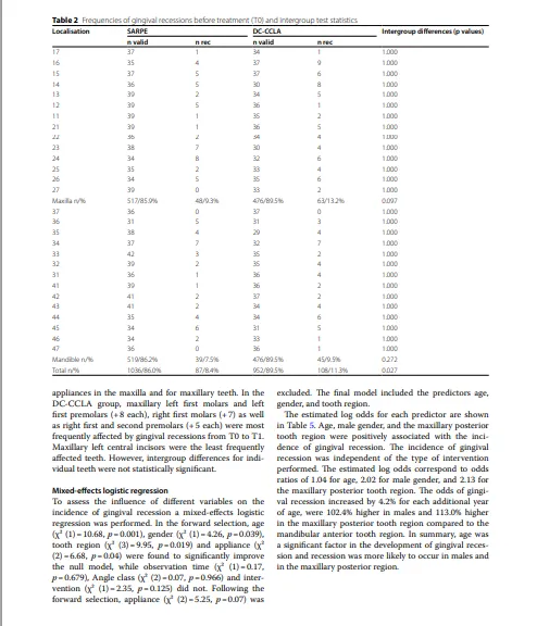执行基于似然比检验的向前变量选择的混合效应逻辑回归,以评估性别、T0 年龄、观察时间、安格尔分类(I、II、III)、扩弓装置(骨承力、牙承力、DC-CCLA)、牙区(上颌前牙、上颌后牙、下颌前牙、下颌后牙)和干预措施(SARPE、DC-CCLA)对牙龈退缩发生率的影响。显著性水平设定为 5%,p 值小于 0.05 视为显著。所有统计分析均使用 R(版本 4.3.2)进行。使用 lme4 包 进行混合效应逻辑回归,并使用 lmerTest 计算估计值的置信区间。