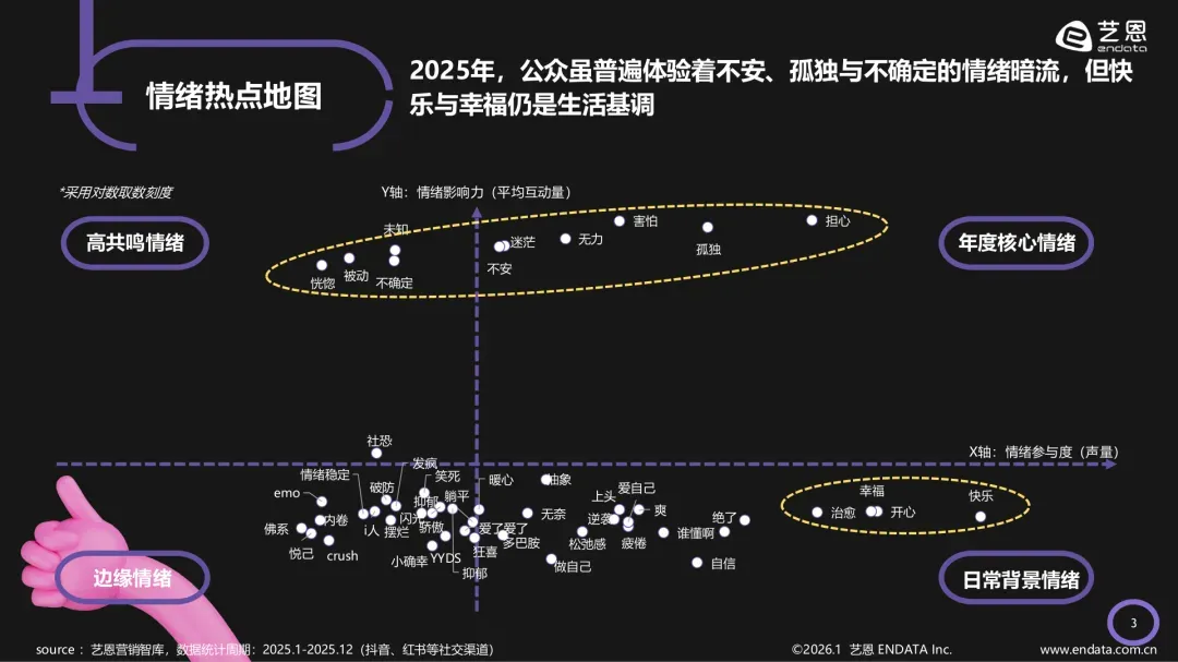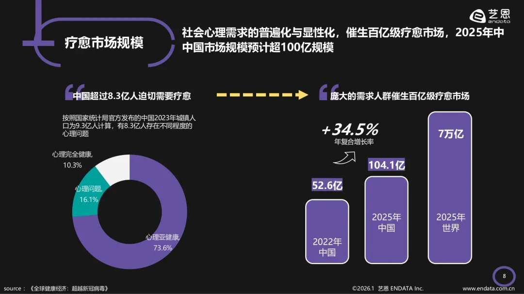 本篇分享的内容是《2026年情绪疗愈“五感”行业洞察报告》?在当代社会,情绪的关照与调节已逐渐从个人私域走向公共议题的中心。一份来自艺恩的《2026情绪疗愈「五感」洞察报告》揭示,随着“情绪价值”成为衡量生活质量与人际健康的重要标尺,一场以感官为载体、以疗愈为目标的消费变革正在悄然发生。报告指出,当前公众普遍感受到来自工作、学业与社会议题的情绪压力,近九成受访者表示正承受不同程度的心理负荷,而消费行为已越来越多地被视作疏解情绪、实现心理补偿的重要途径。在此背景下,“疗愈”不再停留在概念层面,而是转化为明确的消费目的,推动市场需求从基础功能满足转向更深层的自我取悦与体验升级。据报告估算,中国有超过8.3亿人对情绪疗愈存在迫切需求,相应催生的疗愈市场规模在2025年已突破百亿级别,显现出强大的市场潜力与社会心理需求的显性化趋势。值得关注的是,当下的疗愈实践日益呈现系统化、感官化的特征。人们不再满足于单一形式的放松,而是主动通过调动“五感”,营造沉浸式体验来实现情绪的精细化管理。报告中详细拆解了五大感官维度在疗愈市场中的表现形式与消费动态。味觉疗愈成为直抵内心的情感开关。以甜品为代表的“快乐食品”被视作即时情绪调节工具,而融合了助眠、抗焦虑等功能成分的情绪零食也迅速崛起,受到年轻消费群体的青睐。品牌如奥利奥通过绑定“解压”“治愈”标签,将产品口感转化为可感知的情绪价值,成功切入高压生活场景。嗅觉疗愈借助气味与大脑的直接连接,构建起舒缓身心、唤醒记忆的香气场域。香薰、香水及香氛洗护产品占据市场主导,其中花香与果香调因其与自然、阳光的关联最受推崇。以观夏为代表的品牌,不仅聚焦于产品本身的疗愈香型,更通过内容叙事与线下体验空间的营造,为用户提供完整的情感意境。触觉疗愈则通过物理接触带来安全感与掌控感。各类解压玩具,尤其是可揉捏、可变形的“捏捏”类产品,成为释放压力、缓解焦虑的重要载体。其设计也日趋多元化,从简单的挤压玩具到结合温度、震动的复合型产品,不断满足用户对具象化压力释放的需求。视觉疗愈强调通过营造环境或聚焦视觉点来实现心理“逃离”。从打造沉浸式光影空间,到观看“修马蹄”、“切肥皂”等具有规律性、爽感强的疗愈视频,再到借助VR技术进入虚拟自然场景,人们通过这些方式暂时屏蔽现实压力,实现注意力的转移与情绪重置。听觉疗愈依托声音对神经系统的直接影响,成为屏蔽纷扰、引导冥想的重要手段。舒缓解压的音乐、白噪音以及冥想引导音频是主流选择,而颂钵音疗等线下体验形式也将古老的声波疗愈与现代人的减压需求相结合,受到市场欢迎。整体来看,情绪疗愈经济的兴起,折射出社会集体心理诉求的深化与个体自我关怀意识的觉醒。它不再是被动的休闲娱乐,而是一种主动的、系统性的身心健康管理实践。未来,如何更科学、更个性化地满足不同人群的感官疗愈需求,将是相关市场持续进化的关键方向。以下为报告节选内容