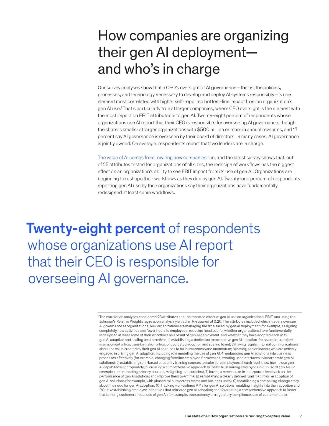 和工作流重构同样关键的,是 AI 治理的顶层话语权。调研数据显示,CEO 亲自监督 AI 治理,和企业生成式 AI 应用带来的利润提升,呈现出极强的相关性。在规模更大的企业里,CEO 对 AI 治理的监督,更是对生成式 AI 贡献的 EBIT 影响最大的单一因素。目前有 28% 的 AI 应用企业,由 CEO 直接负责 AI 治理的监督工作,17% 的企业由董事会直接负责,多数情况下,AI 治理的权责由至少两位企业高层共同承担。