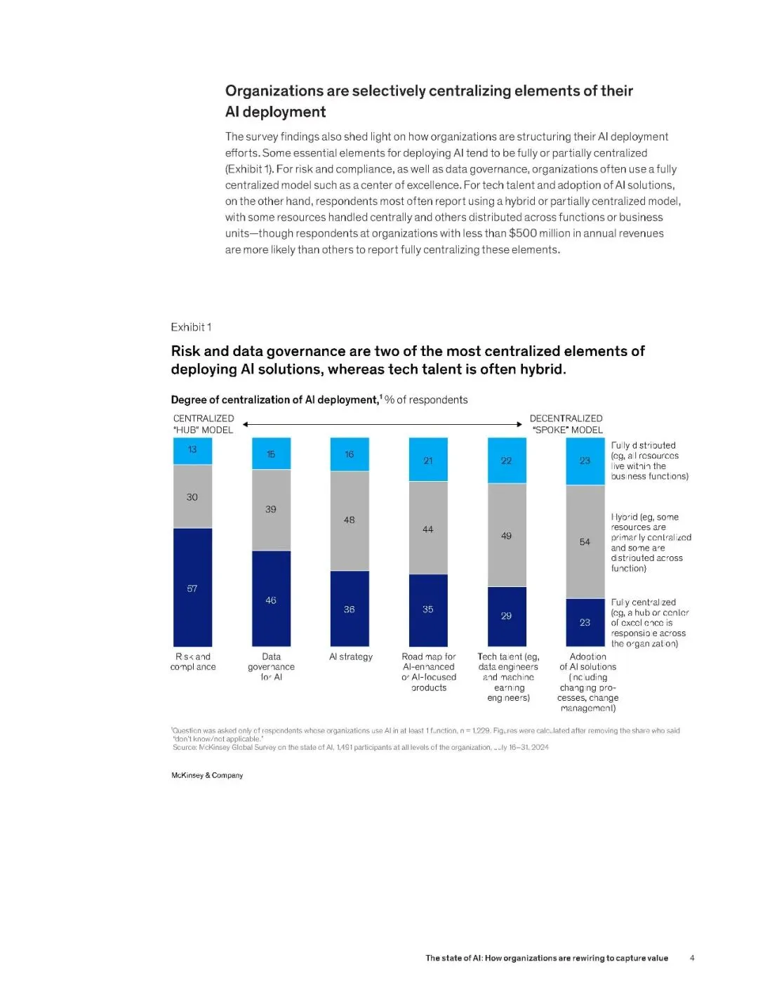 企业正在用集中与分散结合的方式,搭建 AI 落地的组织架构。调研显示,AI 部署的不同环节,企业的集中化程度呈现出明显的差异。风险与合规、数据治理这两个环节,企业最常采用完全集中化的模式,比如成立企业级的 AI 卓越中心来统一管理,其中风险与合规环节,30% 的企业采用完全集中化模式,48% 采用混合模式。