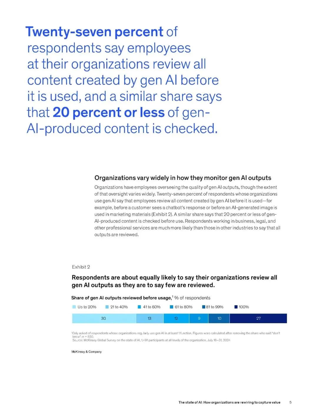 企业对生成式 AI 产出内容的审核,呈现出两极分化的态势。27% 的生成式 AI 应用企业表示,员工会在 AI 生成内容投入使用前,对所有内容进行审核,不管是面向客户的聊天机器人回复,还是营销物料里的 AI 生成图片,都要经过人工校验。还有几乎相同比例的企业表示,只会对 20% 及以下的 AI 生成内容进行审核。不同行业之间的差异格外明显,商业、法律和专业服务行业的企业,对 AI 全量内容审核的比例,要远高于其他行业。